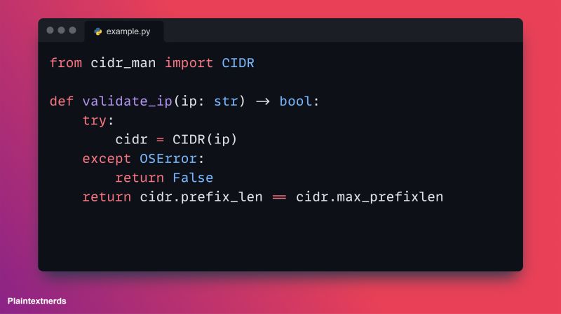 However, there is even a better way. Enter 𝗖𝗜𝗗𝗥-𝗠𝗮𝗻 (author: Tim Armstrong) which is faster than ipaddress and conforms to the current RFCs. 📈