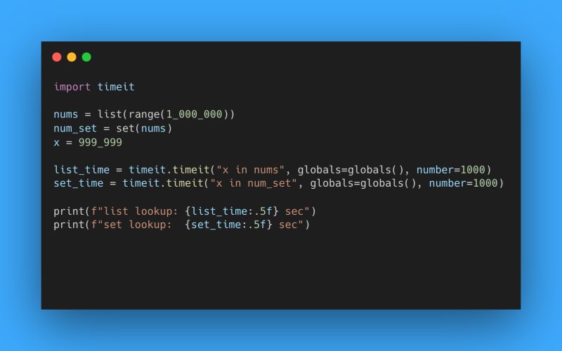 Why? - in list → scans each element until found or end = O(n) - in set → hash lookup = O(1)