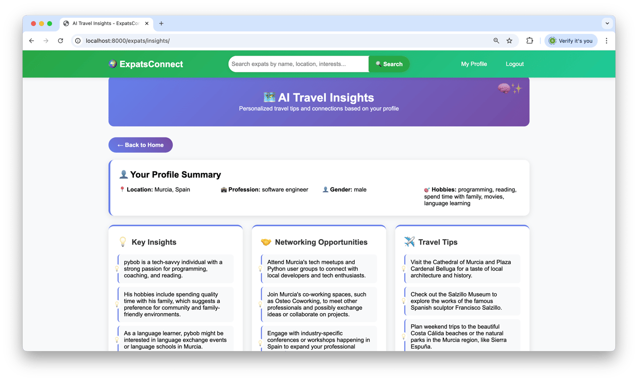Take ExpatsConnect, a project that is coming to fruition in our PDM program using the new and awesome Pydantic AI and Django. I just used it and got the recommendations above, super cool! Interested in learning more about this app / project? Reach out to Rana in our community.