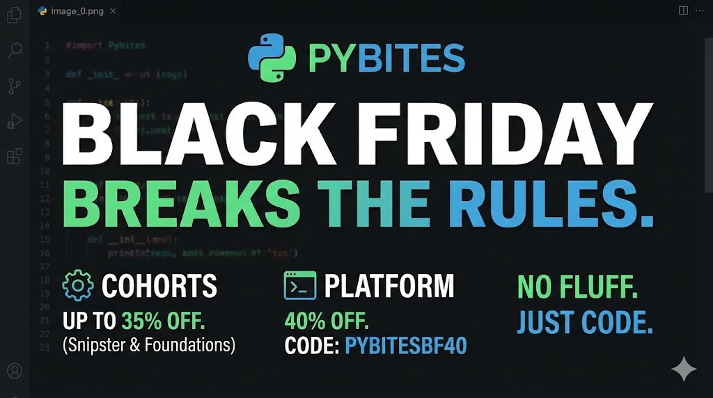 - Pybites Platform: 40% off 6 & 12-month subscriptions (Use Code: PYBITESBF40 at checkout)