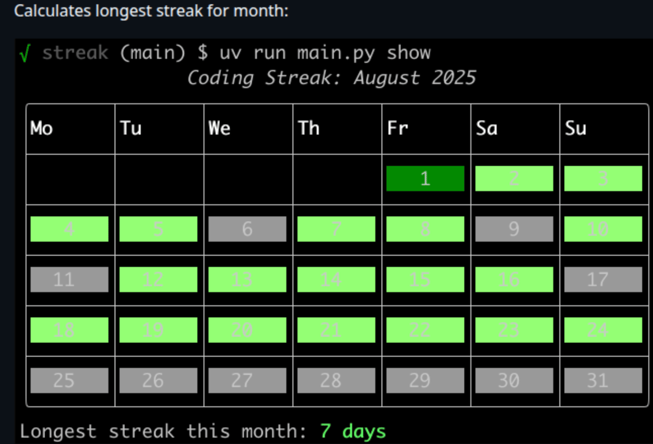 In this one have you build a "streak calendar" in the command line (example above). As always, you can take this as far as you'd like, the main goal is to get coding and build things. Have fun!